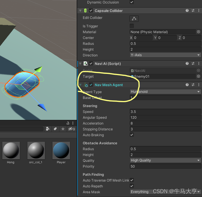 好的有了场景的导航网格,我们现在还需要给想要实现AI移动的物体添加NavMeshAgent导航网格代理,我这里是随便找了个胶囊体当做需要实现AI逻辑的NPC/主角。有了代理我们就可以开始编写脚本了。见下图1-5