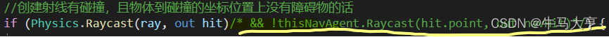 讯享网//创建射线有碰撞,且物体到碰撞的坐标位置上没有障碍物的话 if (Physics.Raycast(ray, out hit) && !thisNavAgent.Raycast(hit.point, out navHit)) { thisNavAgent.SetDestination(hit.point); }