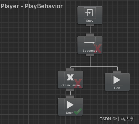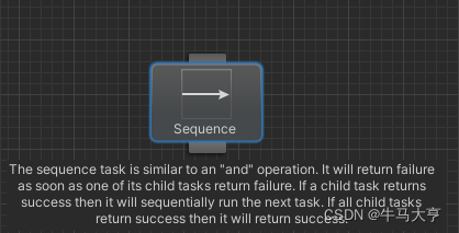 第三个,Sequence顺序序列与上述第一种并行说的一样,一假即假,只要有一个自认无返回失败了,那么整个行为树将判定失败Failure立刻停止。