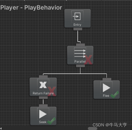 可以明显看到,执行完左边第一个任务Seek,行为树依旧会去执行下一个任务Flee,因为第一个任务执行成功了。
