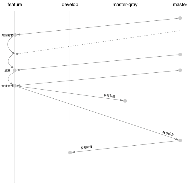 这个是我们的需求分支管理,非常简单,每个需求开始时从线上分支拉一个独立的需求分支,当需求环境提测通过后,合并到灰度分支,灰度验证后,再合并到线上分支发布上线。其中比较重要的是一定要经常从master合最新代码到自己的feature分支。