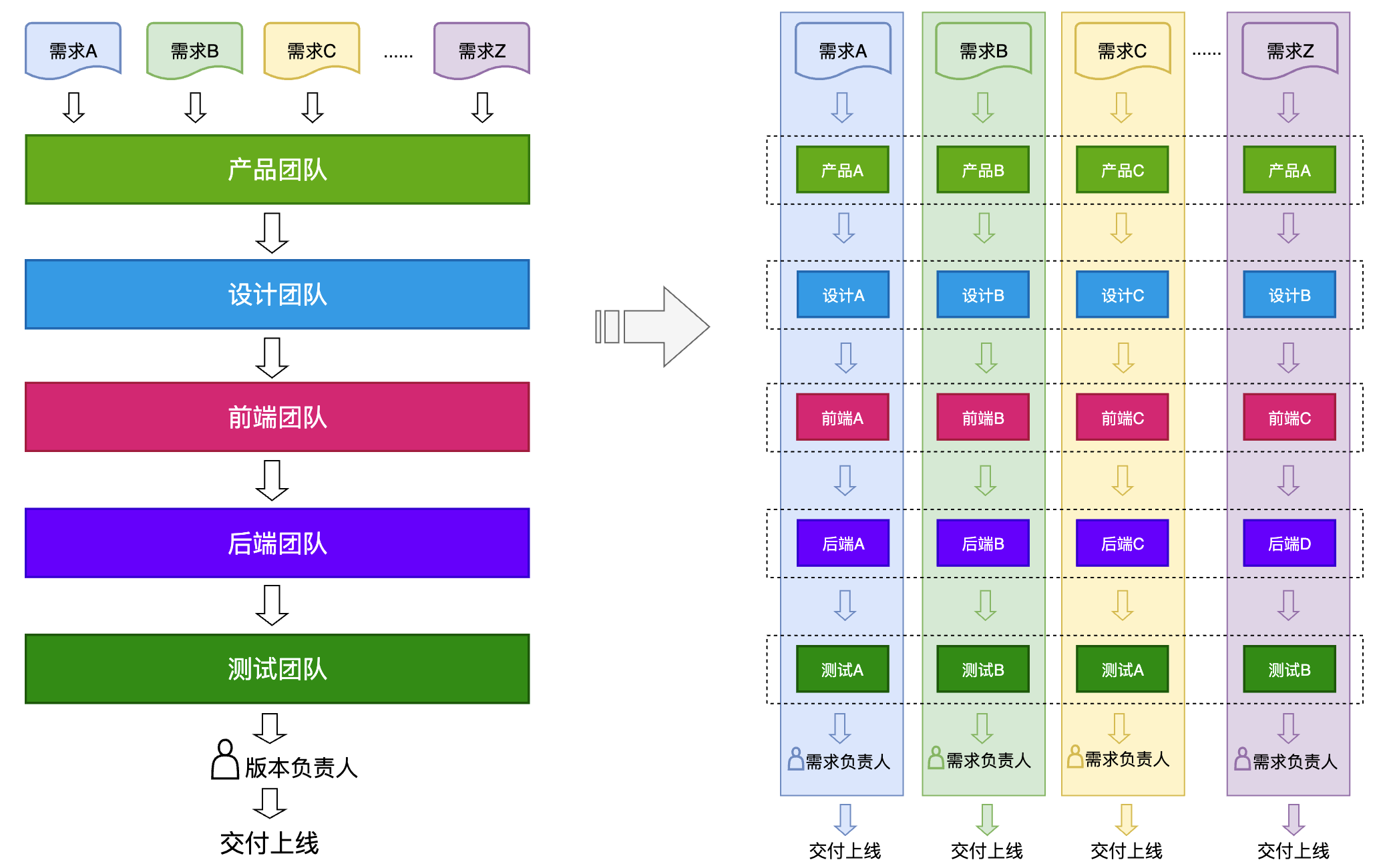 右边是为了适应敏捷交付调整的组织形式,每个需求都会有一个临时的虚拟小组来负责,需求只在这个小组内部流转,最后由需求负责人交付上线。在这种模式下,团队组织的边界不再是职能,而在于需求。虚拟小组的成员需要关心一个需求的全生命周期,能更好的理解需求。当有需求变更时,影响范围也相对小得多。并且通常会在方案设计过程中研发和产品一起讨论调整需求。