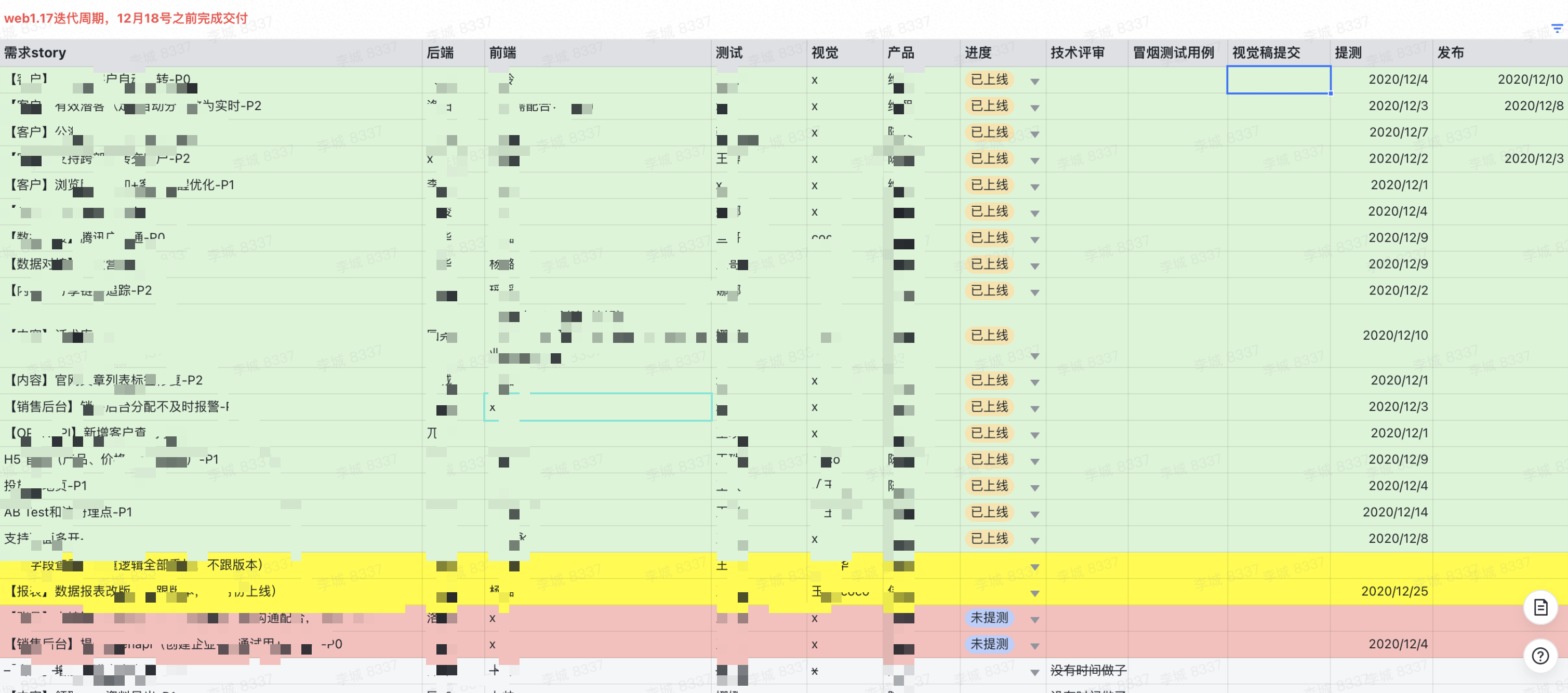 这个是互客某一个版本的需求列表,以及分工,时间规划等等。可以看到大部分是正常需求,黄色部分是比较大的不跟版本的需求,红色和划线的是延期或取消的需求。需求的交付变成了一个灵活的过程。