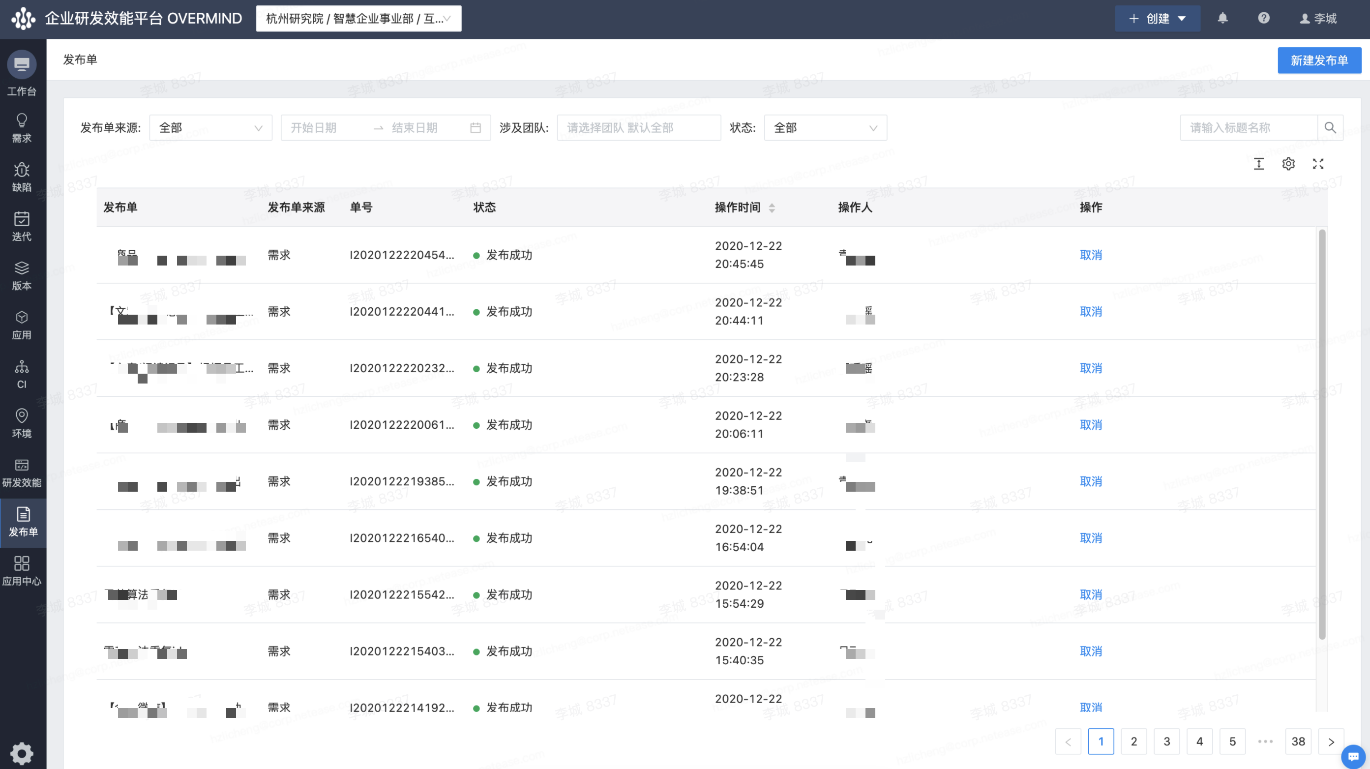 工具是流程的承载,没有合适的工具是很难把流程执行起来的。网易内部的ovemrind效能平台可以很好的支持我们的流程,配合协作文档,测试用例管理平台和测试自动化平台,基本上可以比较好的支持整个流程了。下面的截图是某一天下午的发布单,可以看到一下午就有多次发布。