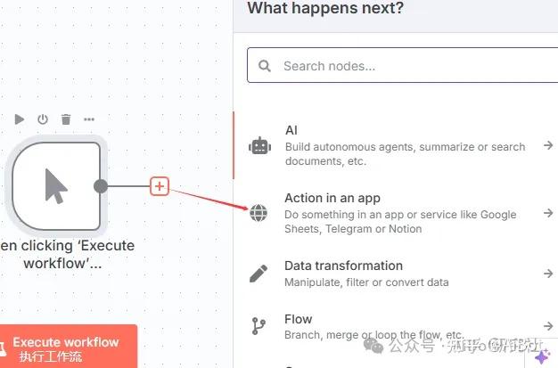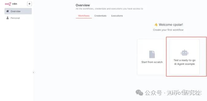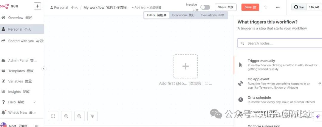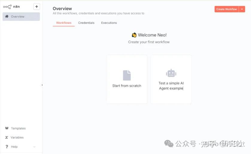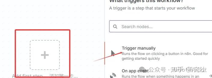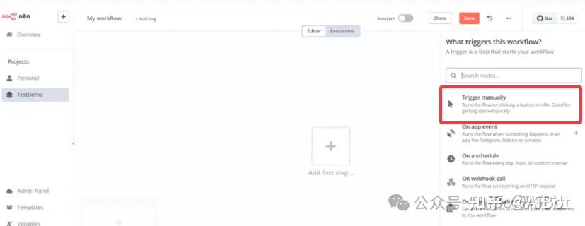 为了更好的入手,我们先不用官方的模板,自己手动从0开始建立工作流。新建工作流在n8n仪表板点击“Create Workflow”,添加作为触发器节点。