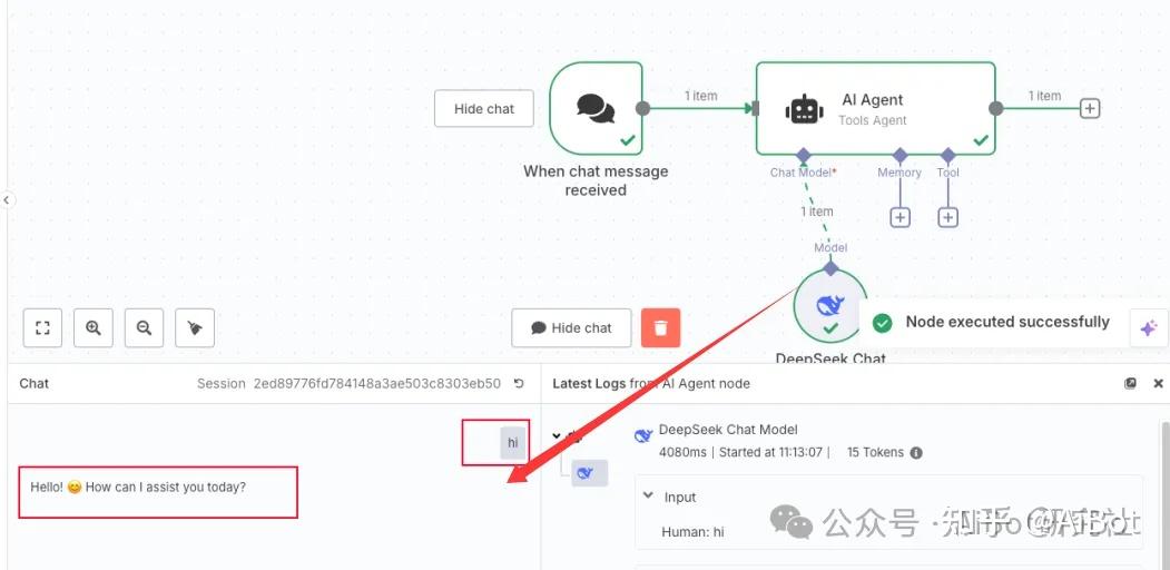 完成后,在回到工作流画布界面,开始验证,点击 open chat 给 AI发一条信息: