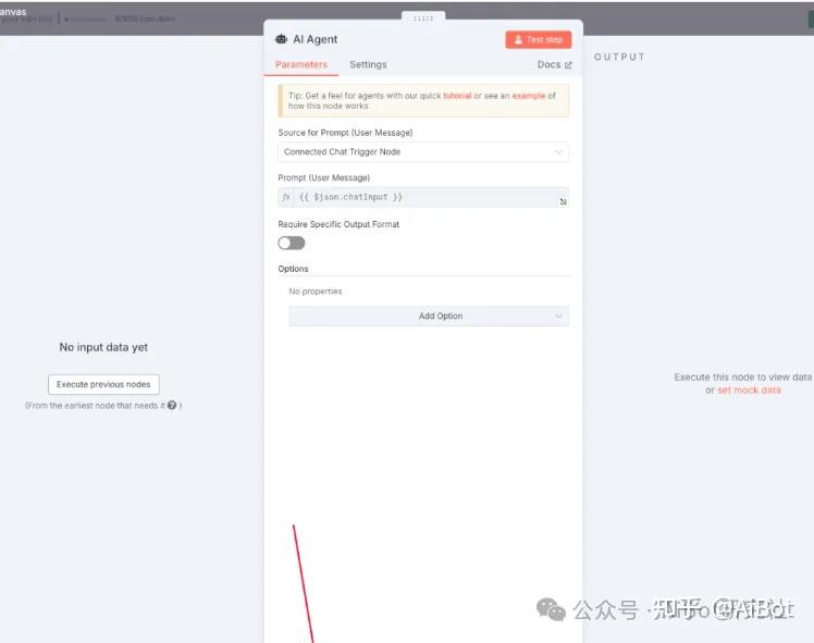 可以用浏览器访问之前本地部署n8n后给的本地地址,直接进入到工作流界面。在n8n的主界面,我们首先点击右侧的使用现成的AI Agent模版进行创建即可,打开后,我们能看到n8n官方已经给提供了一个基础的工作流模版。可以试着尝试下。这个基础的工作流的流程是接受到聊天信息后传导至后边的AI Agent模块,然后调用聊天大模型。