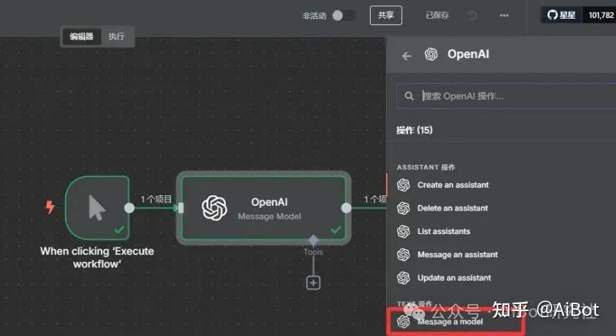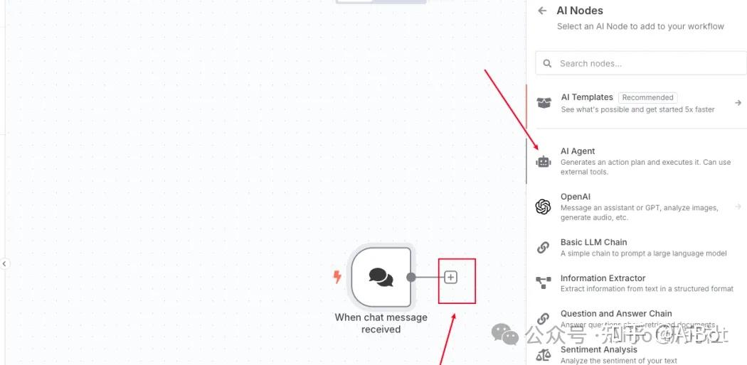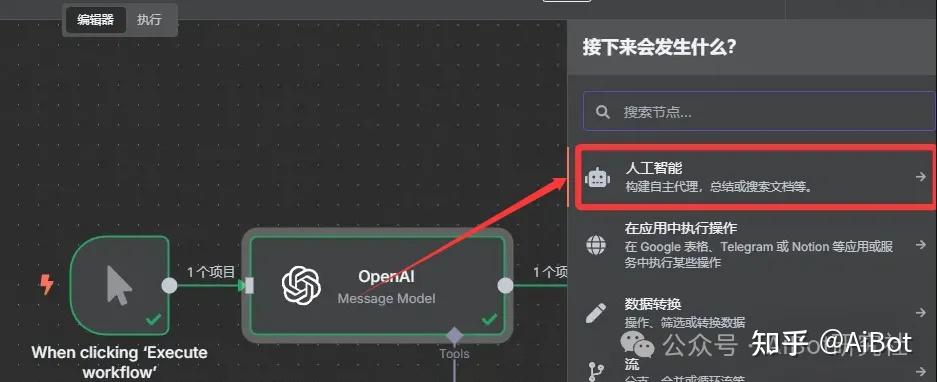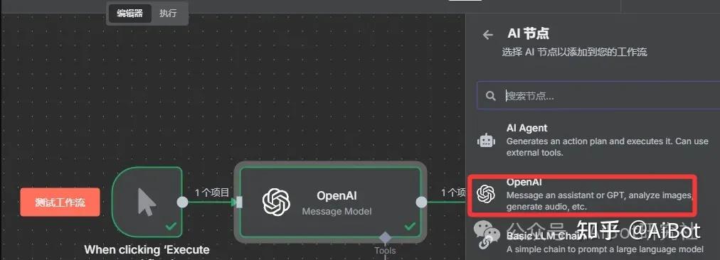 创建工作流跟前文流程一样,这里不一一介绍了。我们直接进入AI节点添加,选择 OpenAI。