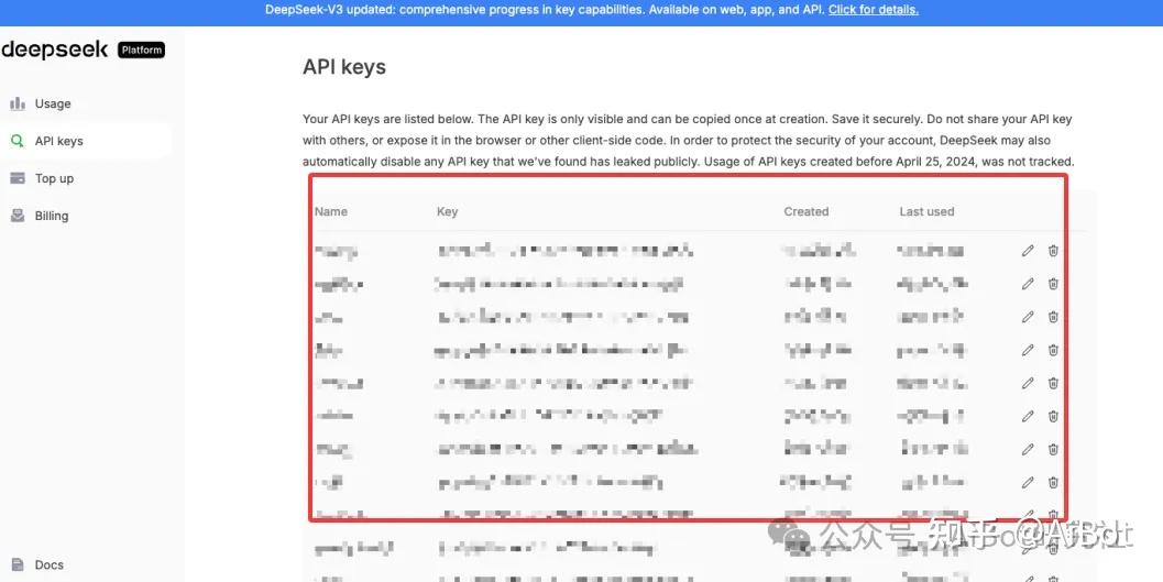 获取 API 密钥:首先,登录你的 DeepSeek 平台账号。在左侧导航栏找到 “API 密钥” 或类似入口。点击 “创建新的 API 密钥”。给你的密钥起一个名字(例如:n8n-test-key),然后创建。