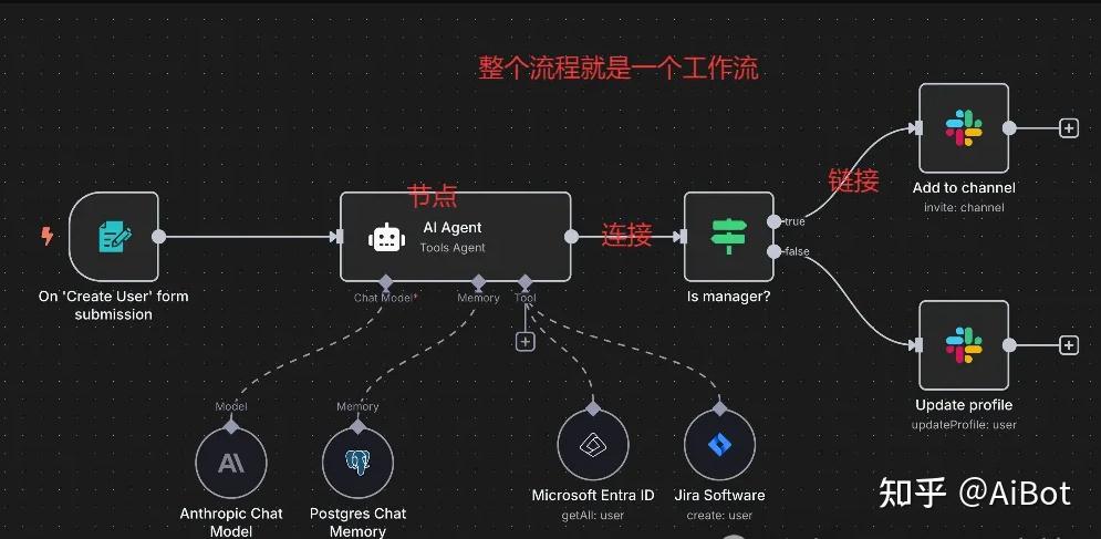 - 节点 (Nodes):就像不同功能的乐高积木,代表着一个个应用或服务(比如企业微信、飞书、邮件、数据库、AI 服务等)。