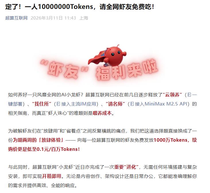 超算互联网向每位OpenClaw用户免费发放1000万Tokens还在观望 股票账户早备好 行情来了及时上车 gt gt 3 月 11 日消息 国家超算互联网宣布面向平台的全体 OpenClaw 用户 免费发放每人限时 2 周总计 1000 万 Tokens 额度 同日 超算互联网还公布了 OpenClaw 的 Token 续购价格 0 1 元 百万 Tokens 较市场均价有一定降幅