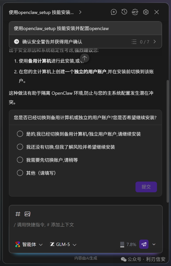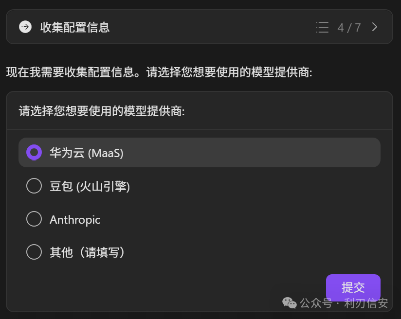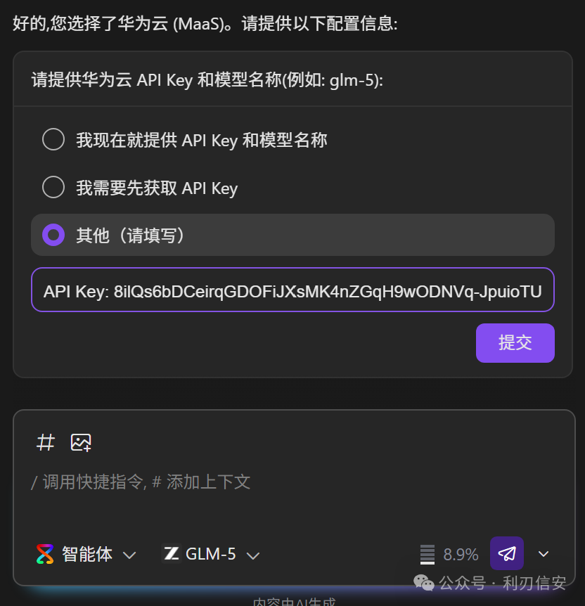 注:大家先按照图中的选项选择其他,然后根据提示在输入框中填写API Key和模型名称,因为在我自己调试的时候发现,选择第一和第二的选项,智能体可能会出现直接跳过配置往下走,导致配置失败的可能!后续我将优化一下skill解决这个问题…