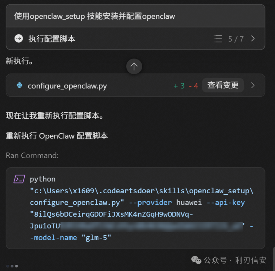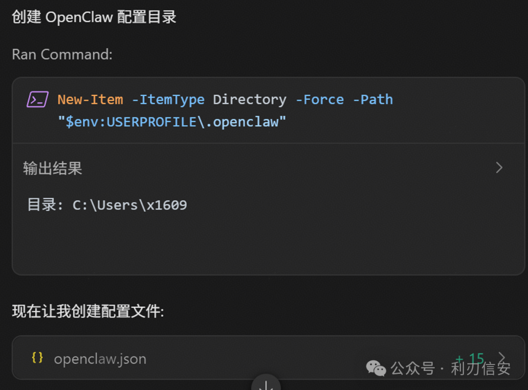 随后Agent会创建OpenClaw的配置文件,此处可能执行Python配置脚本,也可能直接写配置文件。(Windows场景优选直接写配置文件)