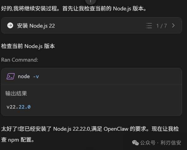 步骤三: 智能体自动完成Node.js、OpenClaw的安装,这里特别提一下,很多小伙伴可能会遇到下载速度慢的问题,这里推荐大家使用CodeArts镜像站(这部分我已经写在skill里,供大家参考)