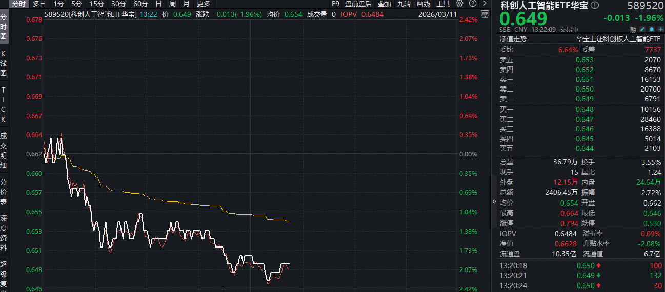 今日(3月11日)重点布局国产AI产业链的科创人工智能ETF()场内价格一度跌超2%,现跌1.96%,资金或迎逢跌布局国产AI赛道机遇,上交所数据显示,该ETF此前5日累计吸金936万元。