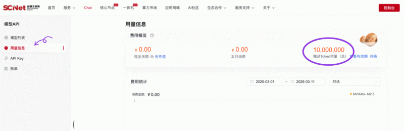 用户还可以通过【Chat】-【模型API】-【用量信息】查询赠送Token的余量情况。