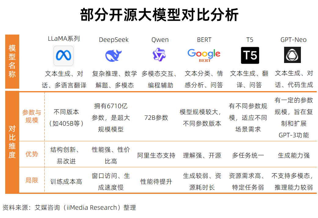 当前,市面上开源AI大模型各有优势:LLaMA系列架构创新、处理能力出色,但训练成本较高;DeepSeek性能强劲且成本较低,仅艺术表现力稍弱;Qwen则在中文NLP及长文本处理方面具备优势。