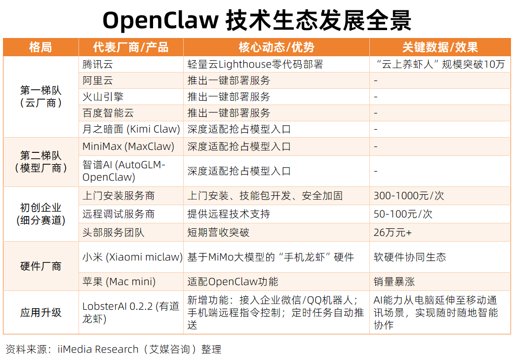 初创企业则聚焦上门安装、技能包开发、安全加固等细分领域,形成“300-1000元上门安装”“50-100元远程调试”的服务市场,部分头部团队短期内营收突破26万元。此外,硬件厂商加速入局,小米推出基于MiMo大模型的“手机龙虾”Xiaomi miclaw,苹果Mac mini因适配OpenClaw销量暴涨,形成“软硬件协同”的竞争新态势。