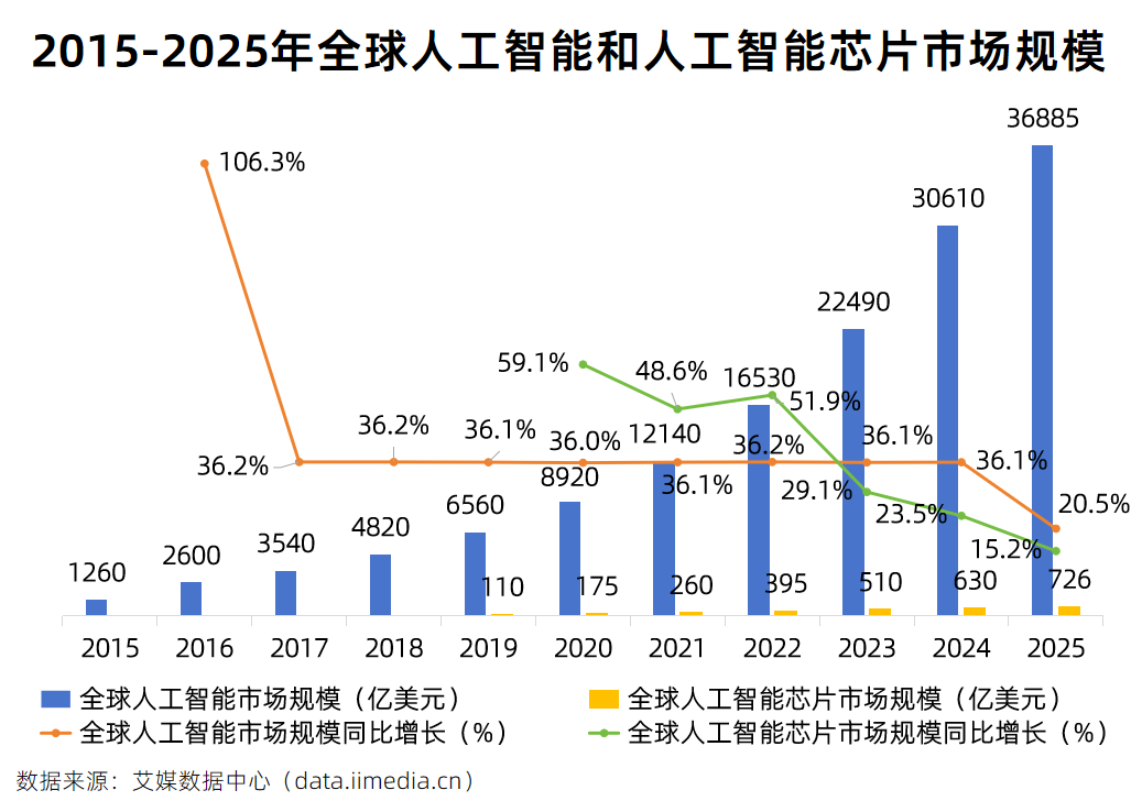 芯片是算力的核心载体,国产芯片企业加速布局,、龙芯中科、寒武纪等推出的AI芯片,实现对OpenClaw的底层算力支撑。iiMedia Research(艾媒咨询)发布的《2024-2025年中国人工智能行业发展趋势研究报告》显示,全球人工智能及人工智能芯片市场均呈显著增长态势,2015年全球人工智能市场规模1260亿美元,2025年达36885亿美元;2019年全球AI芯片市场规模110亿美元,2025年增至726亿美元。