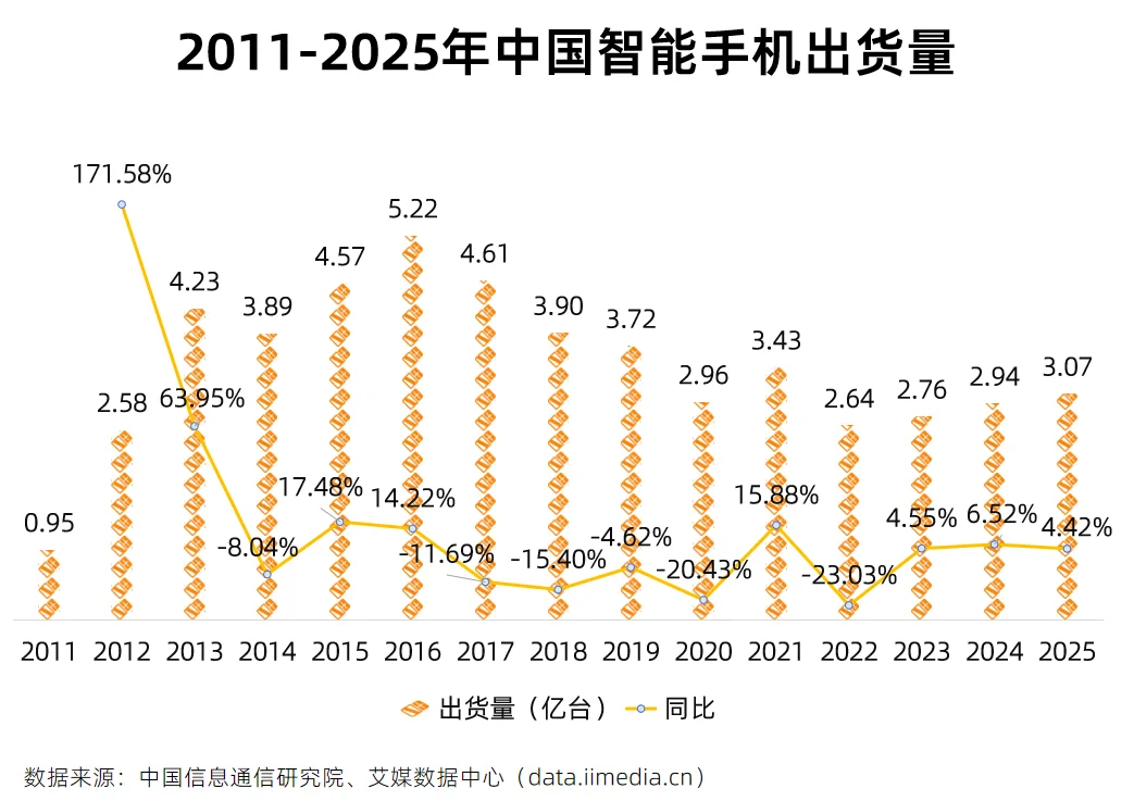 数据显示,中国智能手机市场已渐趋饱和,2016年出货量达5.22亿台峰值后进入波动调整期;2025年手机市场出货量3.07亿台,其中5G手机占比86.9%,智能手机占比92.8%。