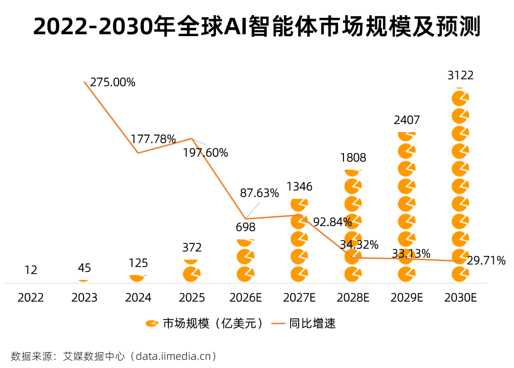 iiMedia Research(艾媒咨询)数据显示,全球AI智能体整体市场规模在2025年迅速飙升至372亿美元。从增长逻辑来看,短期增长源于部署服务需求爆发,包括上门安装、云端部署、技能包开发等增值服务;中长期则依赖场景深度渗透,随着智能体与各行业业务流程深度融合,预计2030年市场规模有望突破3000亿美元。