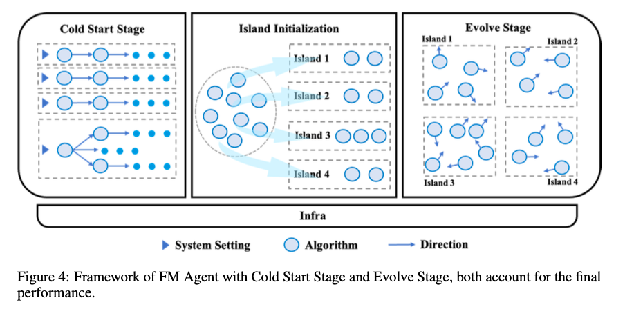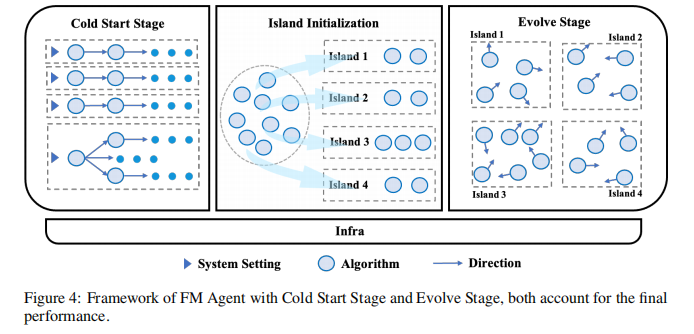 从整体来看,FM Agent框架被设计成用两阶段来解决问题,冷启动(Cold Start)阶段和演化(Evolve)阶段,部署在高性能基础设施上完成任务。