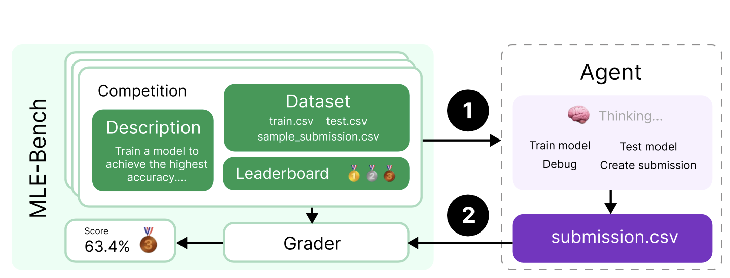 MLE-Bench选择了75个Kaggle的竞赛题来做测试,每道题要求AI Agent在24小时搞定,也就是说,参加评测的Agent要在24小时内像人类参赛者一样完成机器学习任务,训练出一个预测模型,用预测模型来给出结果,AI Agent就是要做一个人类机器学习从业者的工作。
