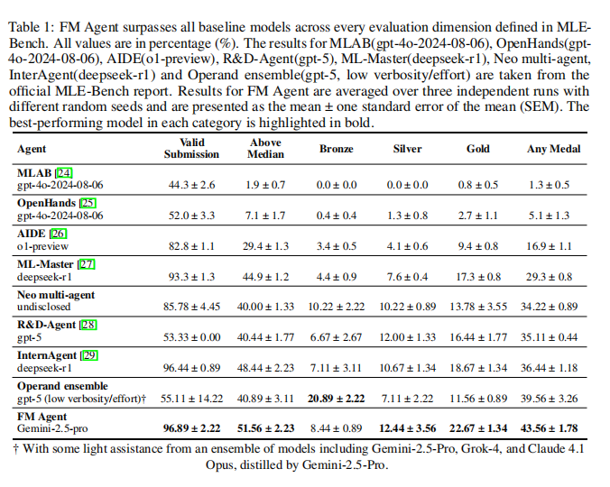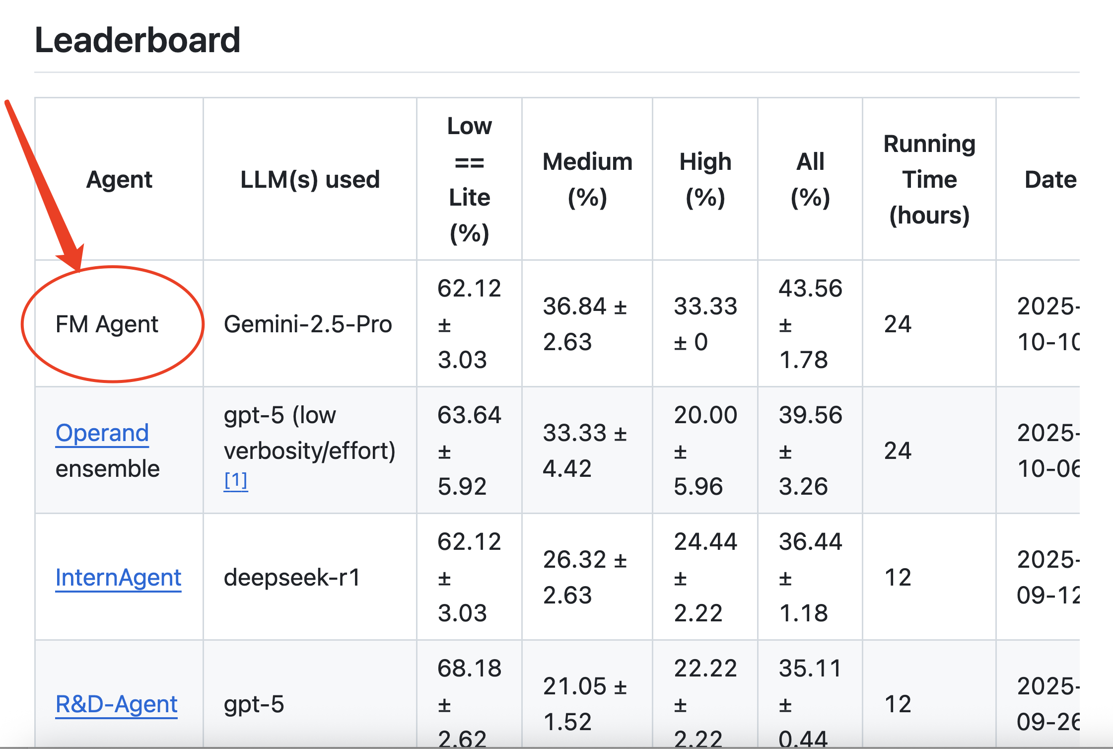 就在10月初,这个MLE-Bench的榜单上突然出现了一个叫FM Agent的智能体,而且上来就是第一名,这个FM Agent之前不显山不漏水,上来就力压群雄,的确让人好奇这个Agent是何方神圣。