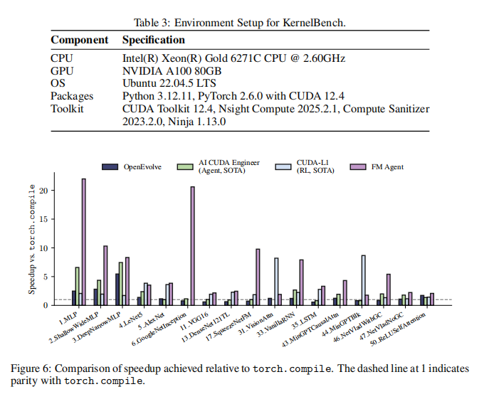 FM Agent 生成的代码,比 torch.compile(PyTorch 2.0 的核心编译器)实现了高达 2.08 倍到 20.77 倍的惊人速度提升 。它还轻松击败了两个此前的 SOTA 竞品—“AI CUDA Engineer”(Sakana AI 的 Agent SOTA)和“CUDA-L1”(RL SOTA)。