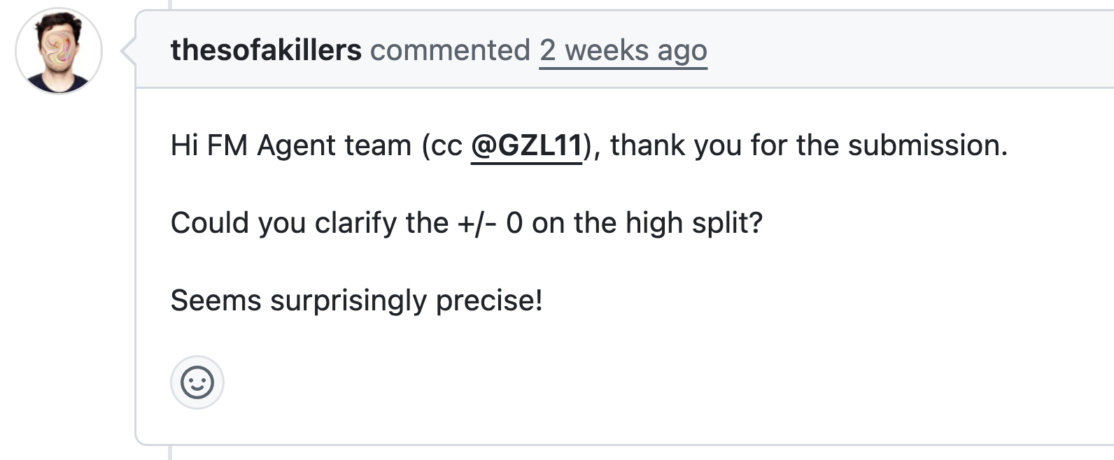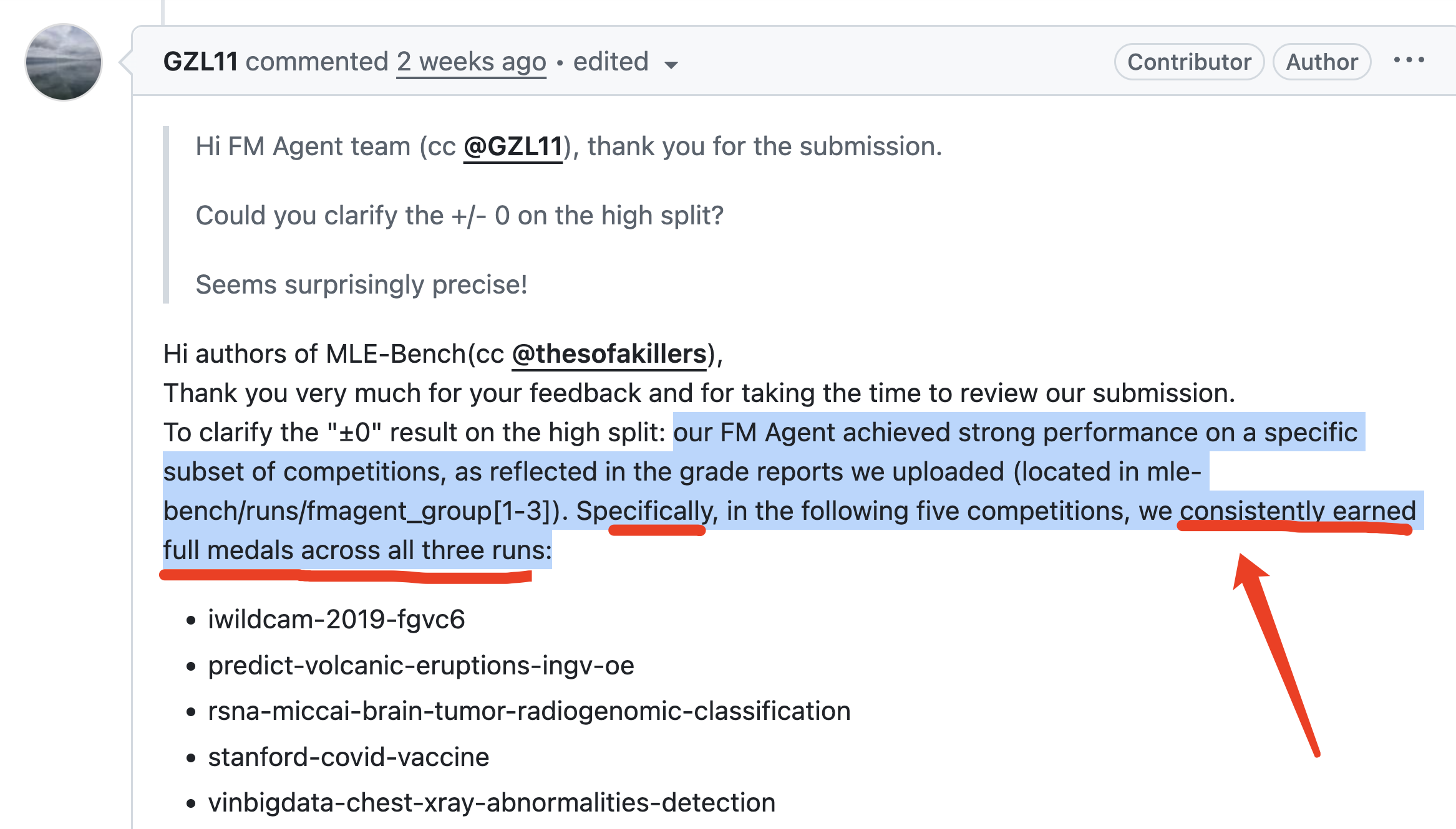 所以FM Agent是百度团队的作品,最近百度在AI方面发力很多,能够有这样的动作倒不奇怪,但是很有趣的是这个PR中还有一段对话,MLE-Bench的官方维护者thesofaikillers问了一个问题:为什么high split部分的+/-是0?这准确度也太高了吧!