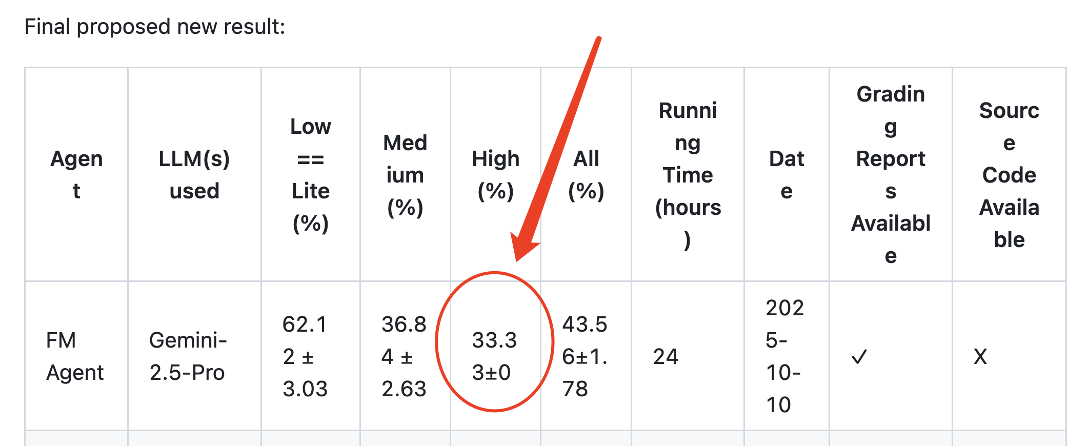 因为以往榜单上所有Agent的成绩都没那么高的稳定度,所以,当FM Agent在High Split这个题集合上不光达到了历史最高的33.33%,而且还是零标准方差的时候,MLE-Bench官方维护者也很诧异了。