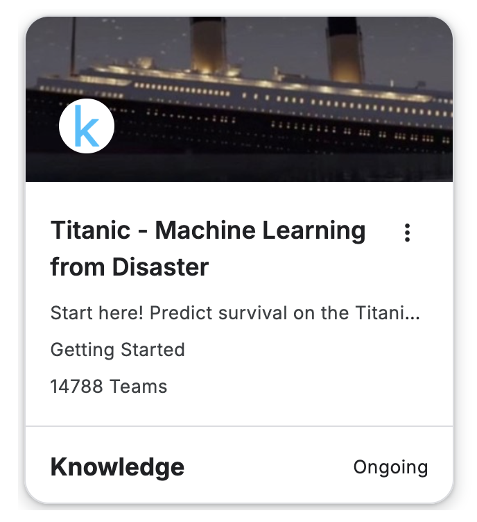 一个典型的Kaggle竞赛就像这样——预测泰坦尼克幸存者概率,给你一个大概的问题场景介绍『从泰坦尼克号沉船中幸存需要一些运气,但是有一些人会比其他人更大概率幸存』,然后给你train和test的数据集,train数据集包含泰坦尼克上一些人的特征数据+是否幸存数据,test数据则只包含特征数据,然后,参赛者就干吧,通过机器学习从train数据集训练出尽量精准的预测模型,提交给Kaggle对于test数据的预测结果,Kaggle会根据预测打分。