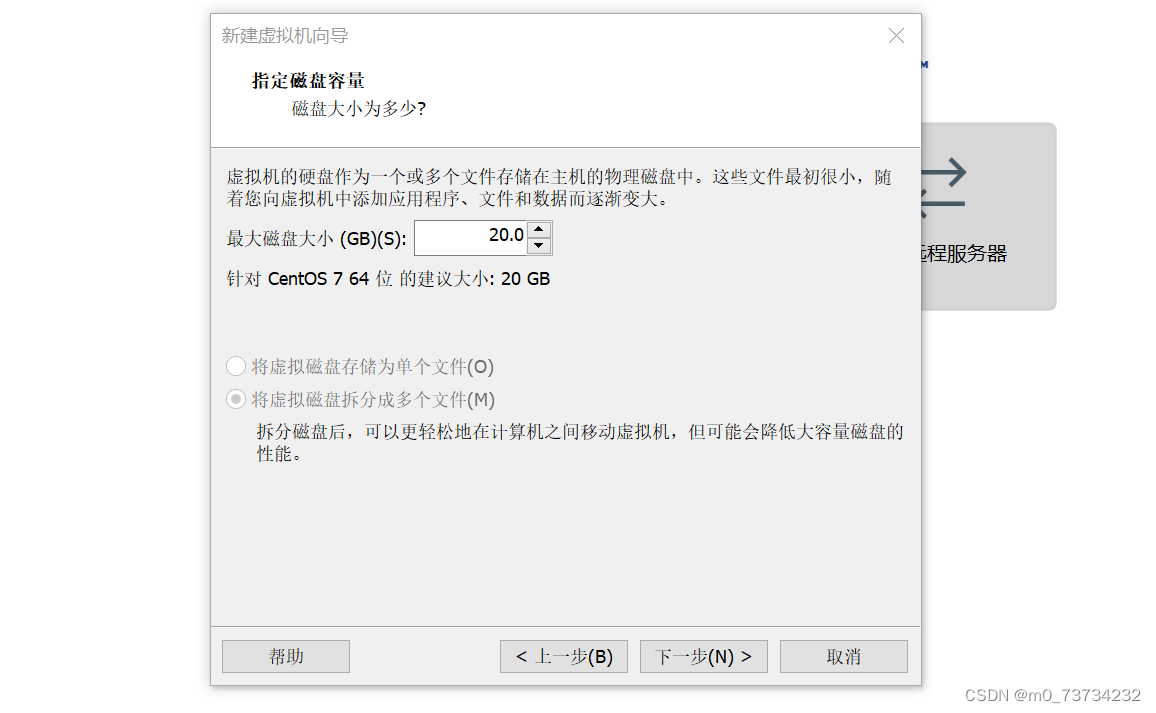 选择20GB作为磁盘大小容量,并且点击下一步。