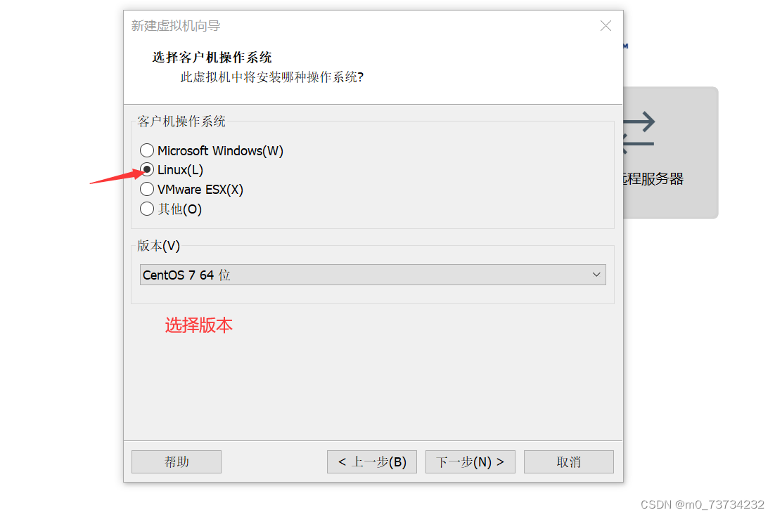 在选择客户机操作系统页面中,选择Linux操作系统,并且版本选择Centos7 64位。