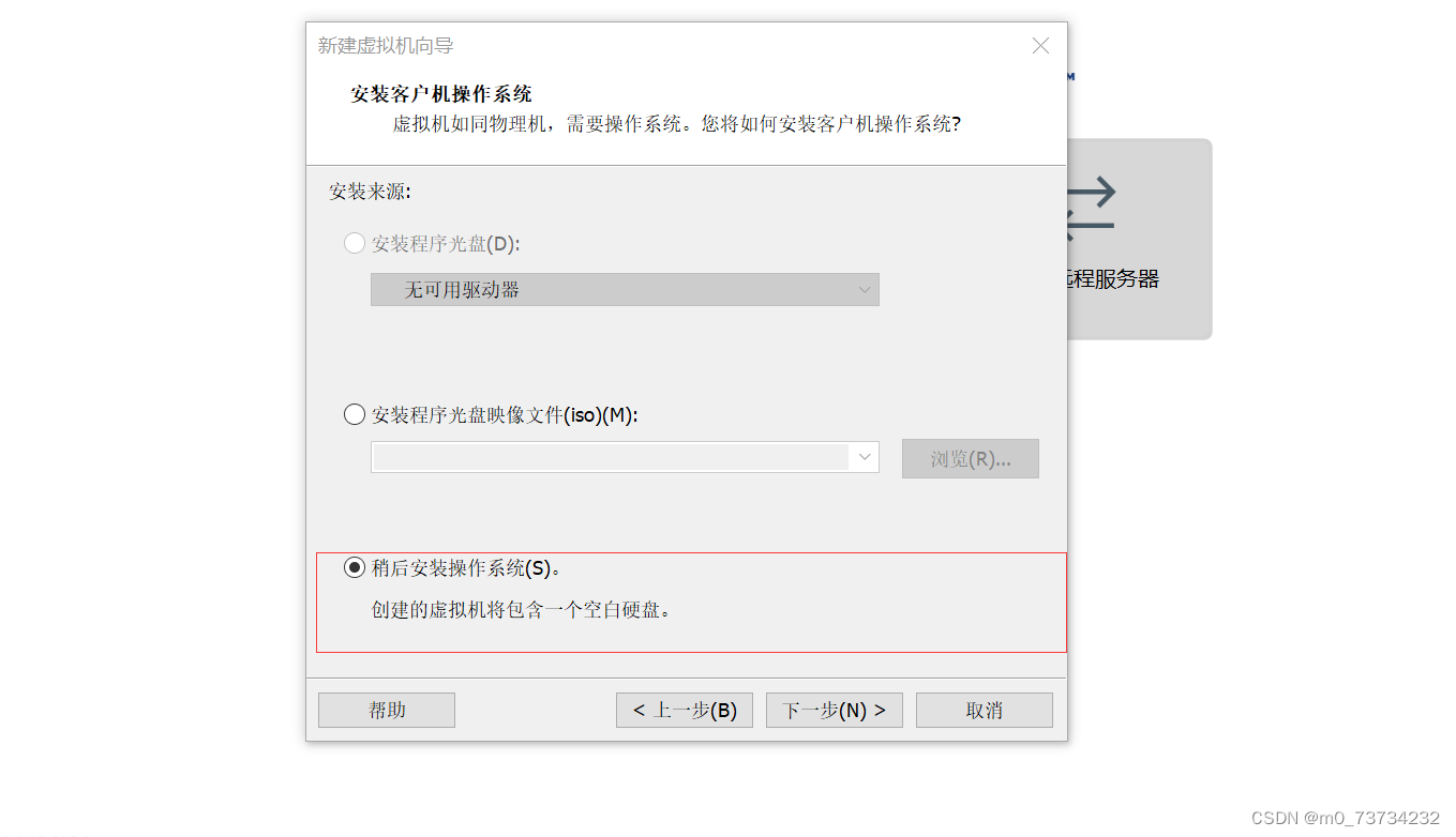 在新建虚拟机导向页面中选择稍后安装操作系统。