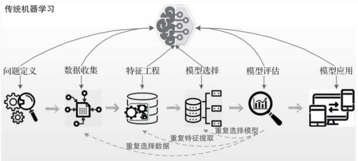 传统的机器学习在解决问题时,首先需要对问题进行定义,然后针对特定问题收集数据,由专家对数据特征进行标定、提取特征、选择特征,然后根据所选特征训练模型、对模型进行评估,最后部署到应用上,以解决最初提出的问题。其中数据收集、特征提取、特征选择、模型训练和模型评估的过程,是一个迭代的过程,需要反复进行、不断优化才能得到较优的模型。这个过程非常耗时费力。