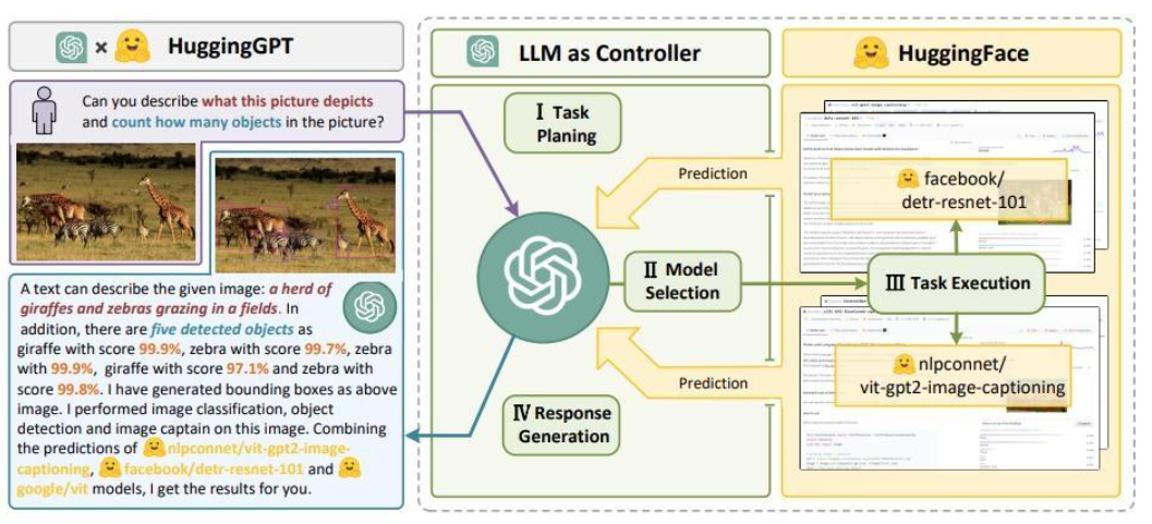 一个非常有意思的“模型选择”Agent。它将用户要求拆解成子任务,再到Huggingface上选择合适的专家小模型执行任务,最后对结果进行处理和返回给用户。