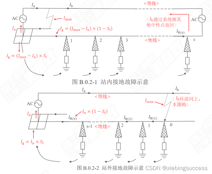 发生站外短路是:Imax=Ia+Ib;从图中可以看出In即短路电流最终通过设备中心点,对其进行分流,由站外分流系数Sf得通过接地网进入的短路电流为Ig=In*Sf,通过地线进入的短路电流为Ig=In*(1-Sf),在进行接地网电阻计算的时候用Ig=In*Sf,考虑直流分量衰减的时候用IG=Ig*Df。