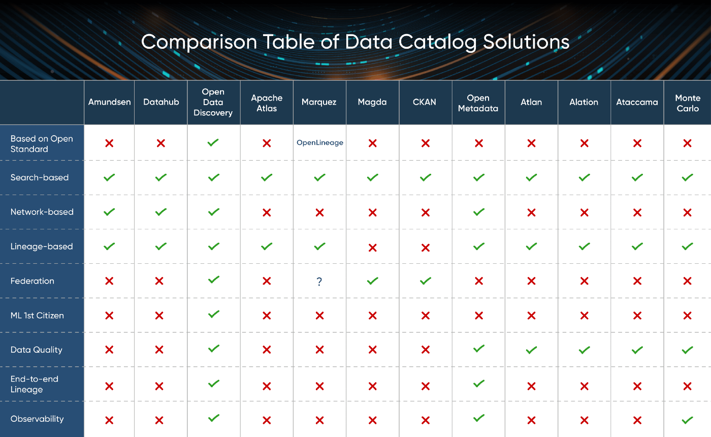 让我们从开源数据目录解决方案的比较表开始,并继续更详细地研究它们中的每一个。请记住,我已经探索了近 30 家不同的数据目录供应商,并将其范围缩小到以下特色。