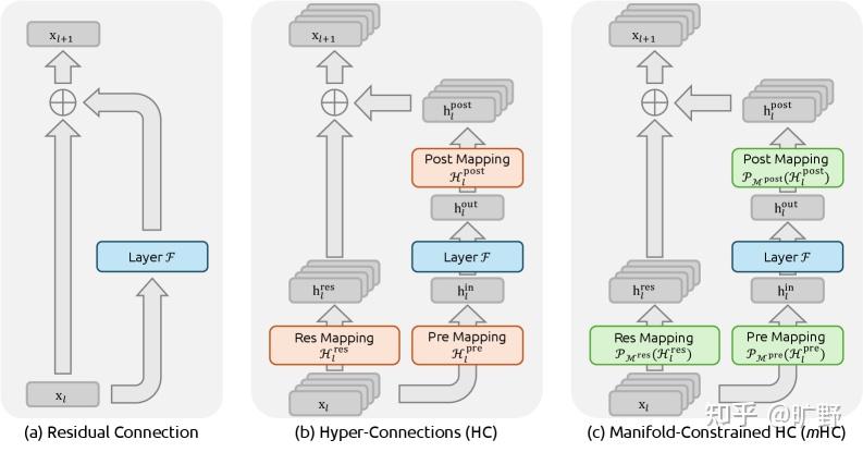 我们再来看DeepSeek论文中的图,最右侧就是mHC,对比HC就很清楚了。