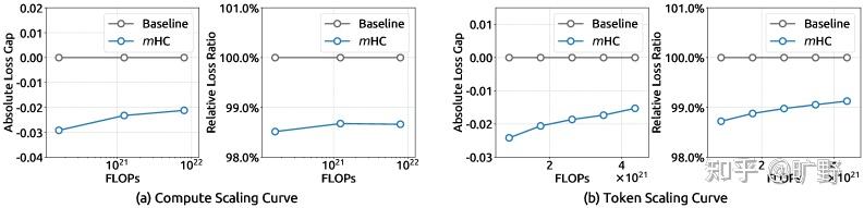 更重要的是稳定性。mHC 的 loss 曲线平滑得像 baseline 一样,梯度范数也很稳定。而 HC 在 12k step 附近那个 loss spike… 在大规模训练中这种抖动是要人命的。Scaling实验也很漂亮。从 3B 到 9B 到 27B,mHC 相对 baseline 的优势始终保持。这说明这不是小模型上的 overfitting,而是真正的架构改进。