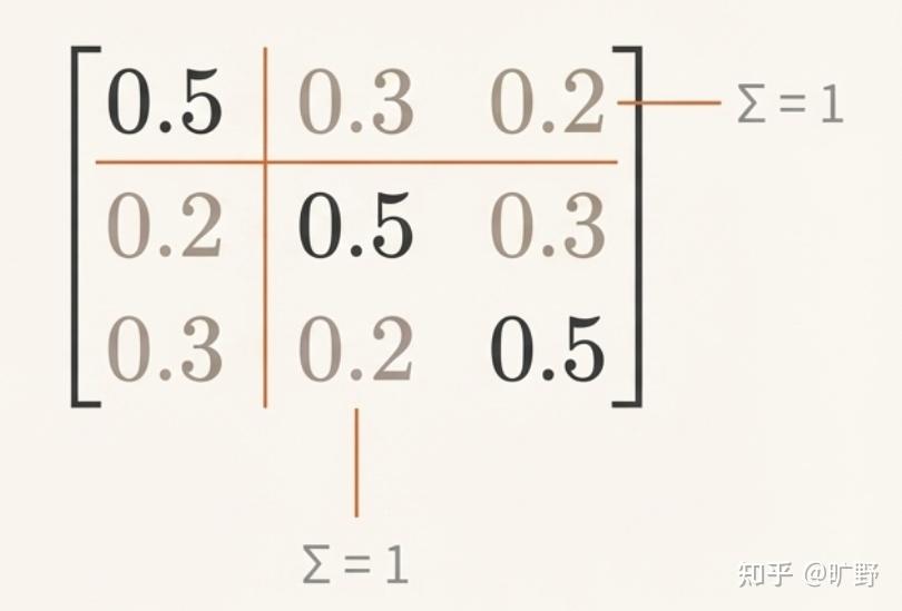 简单点看就是一个”特别均匀”的矩阵——所有元素都是非负的,而且每一行加起来等于 1,每一列加起来也等于 1。