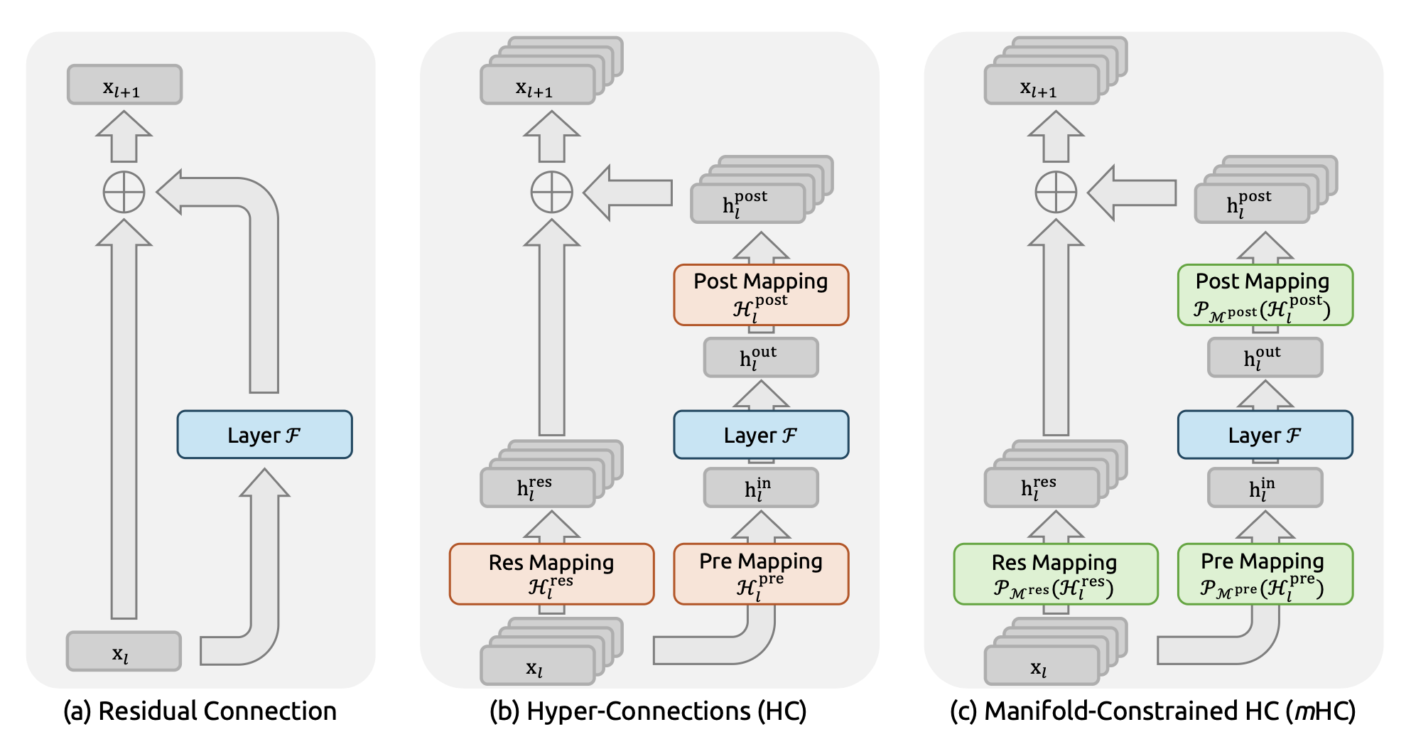 残差连接,这个从 2015 年 ResNet 开始统治深度学习界的基础范式,十年了,就没人敢动它。结果 DeepSeek 直接上手了——基于字节跳动 2024 年提出的 Hyper-Connections (HC) 思路,搞出了一个“流形约束版” mHC。