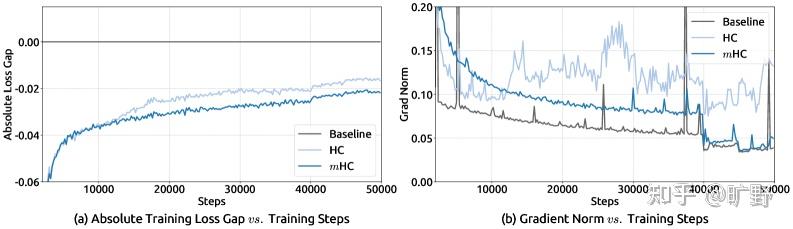 论文里有个很有意思的图(Figure 2),27B 模型训练到 12k step 左右,HC 的 loss 突然飙升。与此同时,梯度范数也开始疯狂震荡。