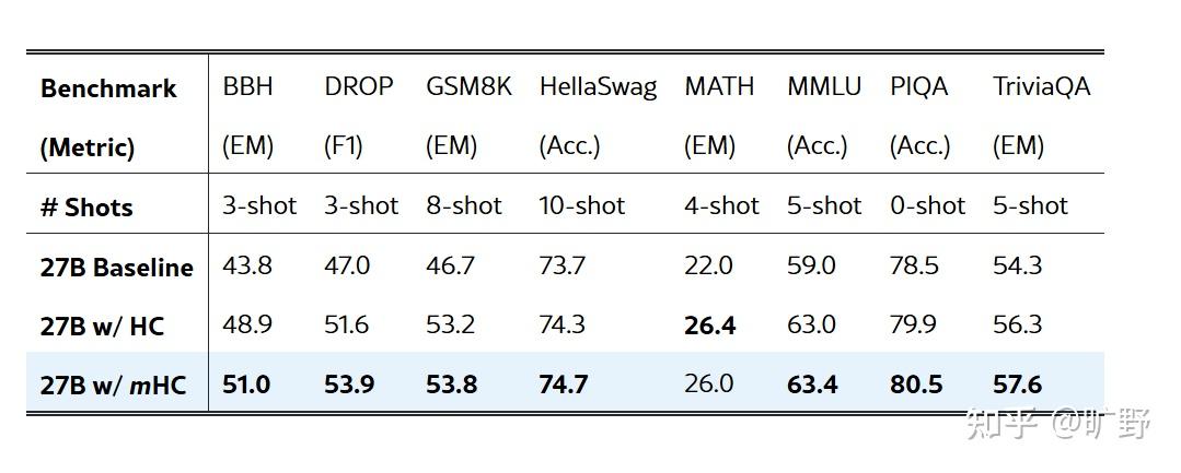 BBH 相对 baseline提升 7.2 个点,这个幅度在 27B 规模上已经非常可观了。要知道这只是通过改残差连接的拓扑结构实现的,没加参数、没加数据、没改训练流程。