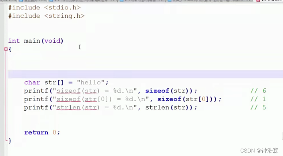 数组里面存字符串的时候,在字符最后其实还有一个“\0”所以sizeof(str)的字节长度是6个;