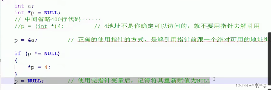 常规做法:定义指针时,同时初始化NULL;在指针解引用之前,先去判断这个指针是不是NULL;指针使用完之后,将其赋值为NULL;在使用指针前,将其赋值绑定给一个可用的地址空间;