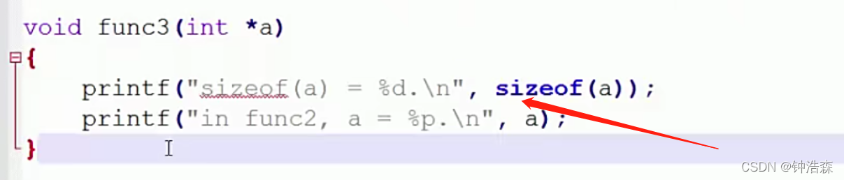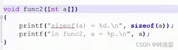 所以在子函数内部,传进来的数组名等于是一个指向数组首元素的指针。所以sizeof得到的是4 下面是子函数;