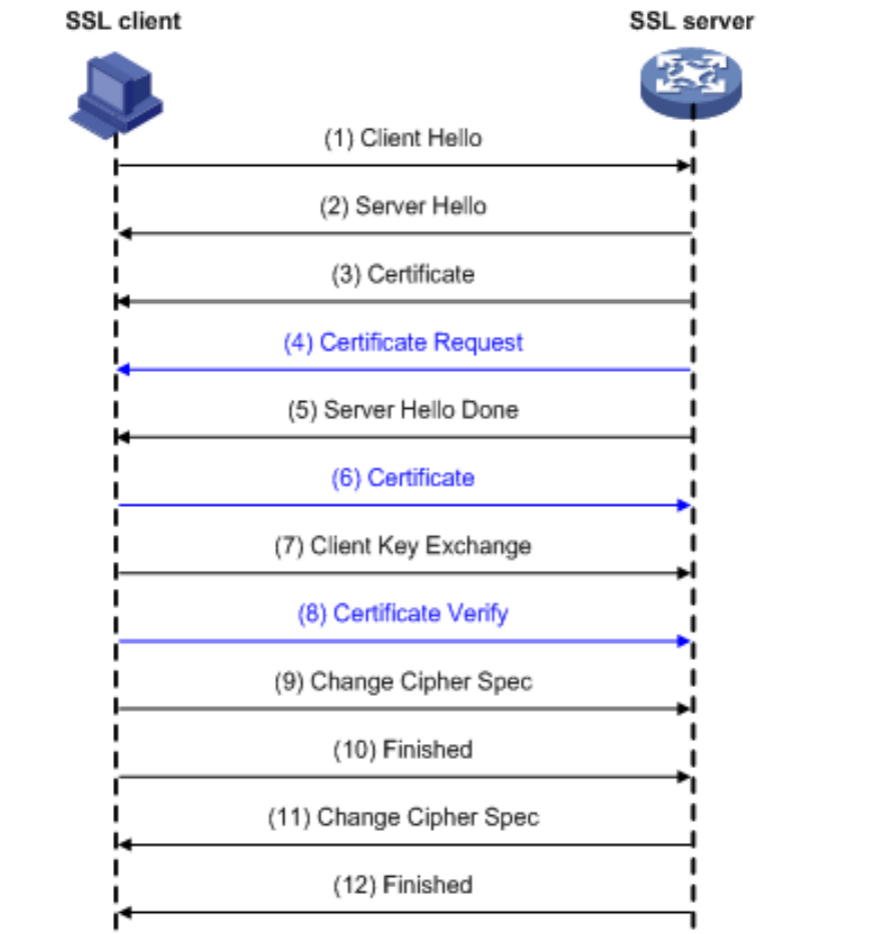 SSL客户端的身份验证是可选的,由SSL服务器决定是否验证SSL客户端的身份。如图4中蓝色部分标识的内容所示,如果SSL服务器验证SSL客户端身份,则SSL服务器和SSL客户端除了交互上一节“只验证服务器的SSL握手过程”中的消息协商密钥和加密套件外,还需要进行以下操作: