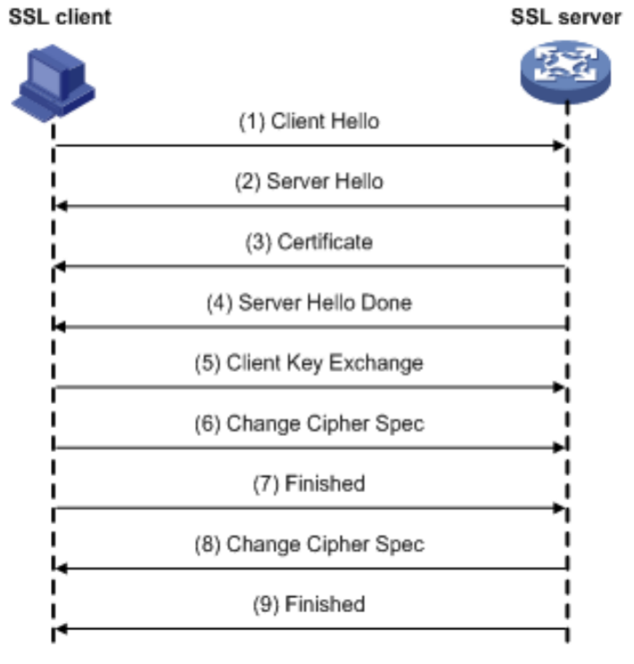 (1)SSL客户端通过Client Hello消息将它支持的SSL版本、加密算法、密钥交换算法、MAC算法等信息发送给SSL服务器。